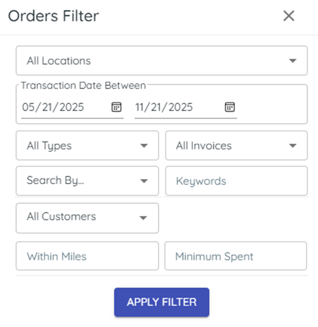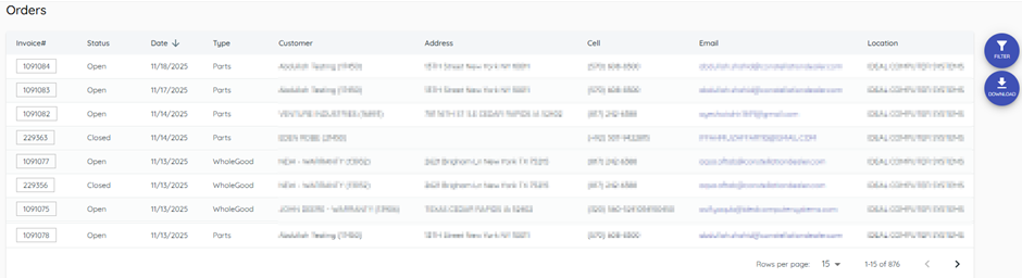 1) Click the filter funnel and set date range or invoice type; search (part/model/serial).